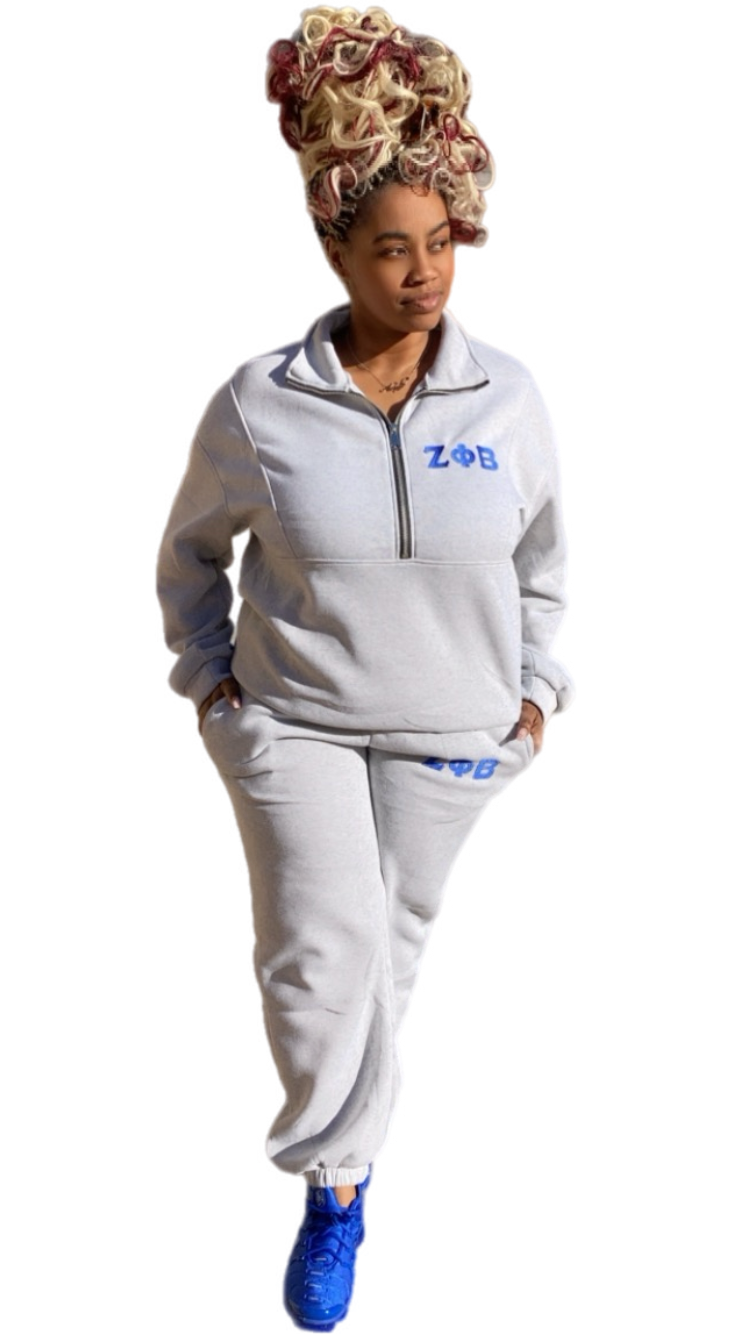 The Royal Routine: Sterling Edition is your go-to grey sweatsuit for elevated everyday wear. Designed with a collegiate edge and timeless Zeta pride, this set delivers comfort, confidence, and effortless style wherever your day takes you.